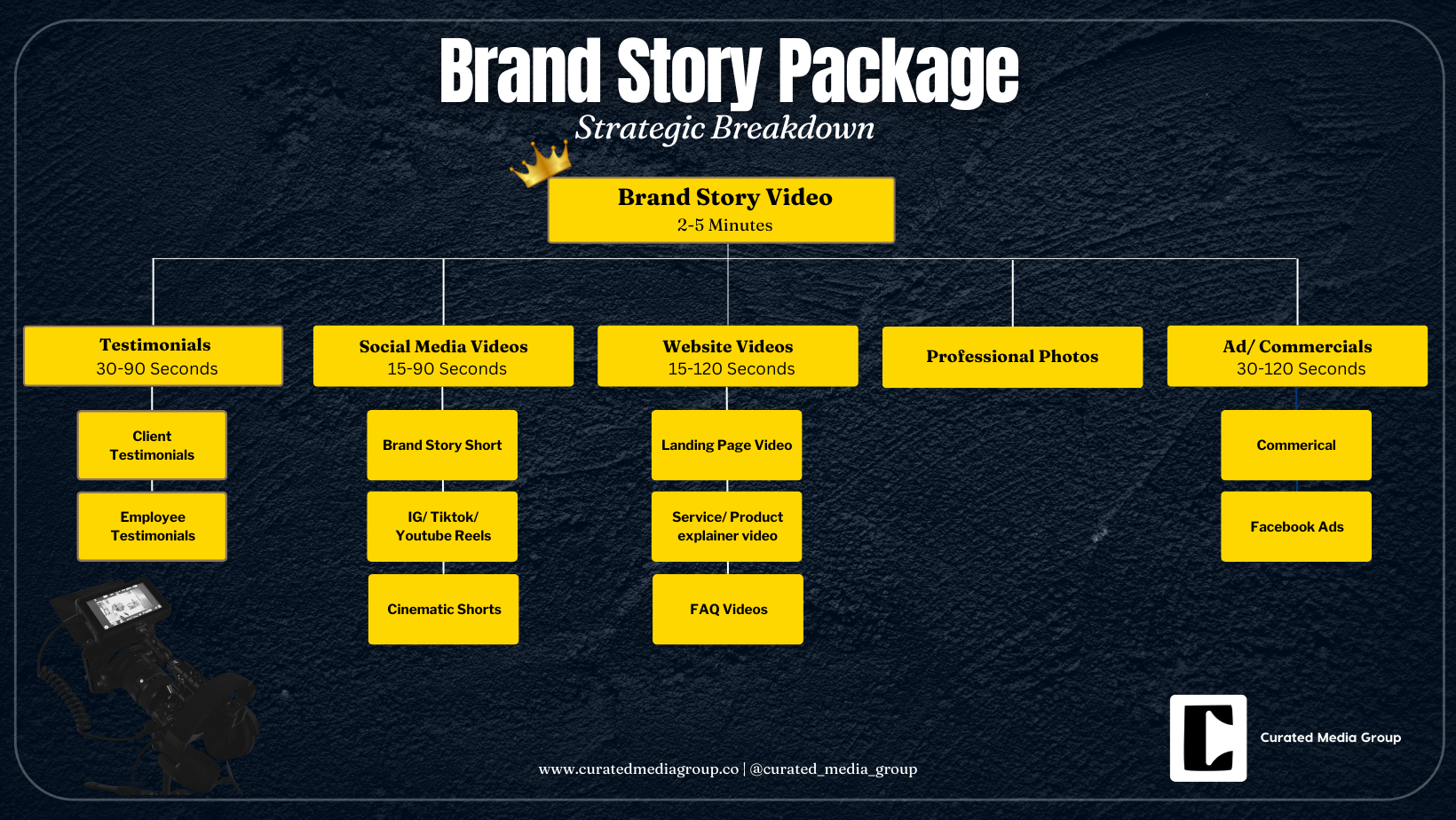 Brand Story Video is the core content that can be repurposed into various formats, including testimonials, social media clips, website videos, and advertisements.